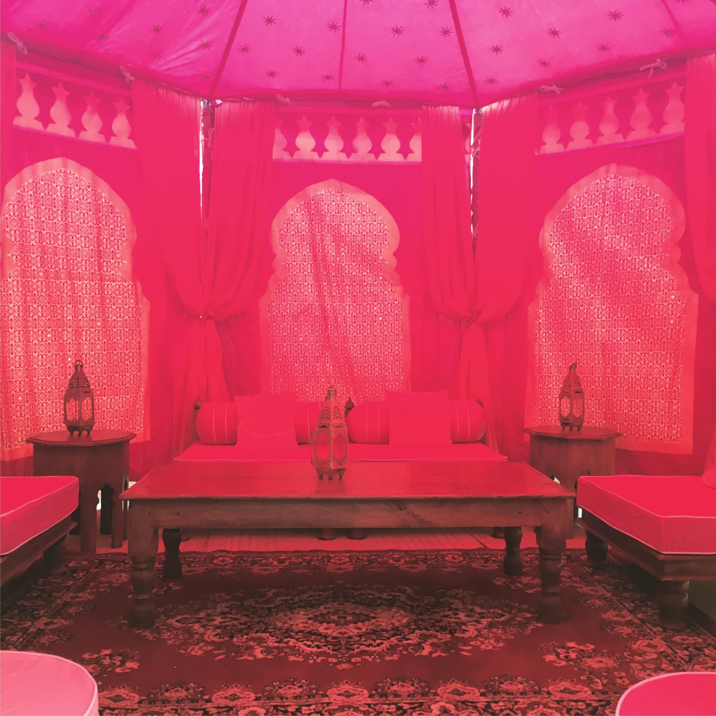 The 4m Pavilion is great for intimate dinner parties, henna parties or as an addition at larger events for musicians or add some of our floor cushions for a children’s party tent. For an intimate dinner party the 4m Pavilion can formally dine 12 guests at a large round table or add some arch walls and our range of low furniture and accessories for an exclusive Moroccan party tent!